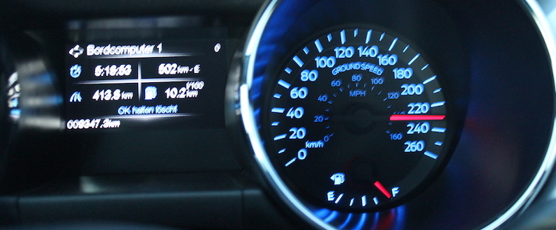 Der speziell für den Mustang konzipierte 2,3-l- EcoBoost-Benzinmotor hat 233 kW (317 PS). Da sollte man denken, dass ein solcher Wagen reichlich Sprit durch seine Brennkammern jagt. Doch das ist nicht so: Bei Spitzentempi erreicht man zwar durchaus 18 Liter, im Schnitt von Stadt, Landcruising und Autobahn aber gerade mal die Hälfte. Der Fahrspaß bleibt dabei über alle Geschwindigkeiten und Fahrmodi immer sehr hoch. Die Menschen in der Stadt schauen, staunen, zeigen das auch und zeigen auch ihre Sympathie mit diesem Kraftprotz, wie das bei anderen Sportwagen so nicht zu bemerken ist. Als Mitglied der International Engine of the Year-Familie verfügt der leistungsstarke Eco-Tec-Vierzylinder über einen Twin-Scroll-Turbolader mit geringem Trägheitsmoment, eine hochpräzise Direkteinspritzung und eine doppelte variable Nockenwellenverstellung, um Kraftstoffverbrauch und Emissionen zu reduzieren und gleichzeitig die Motorleistung zu maximieren.